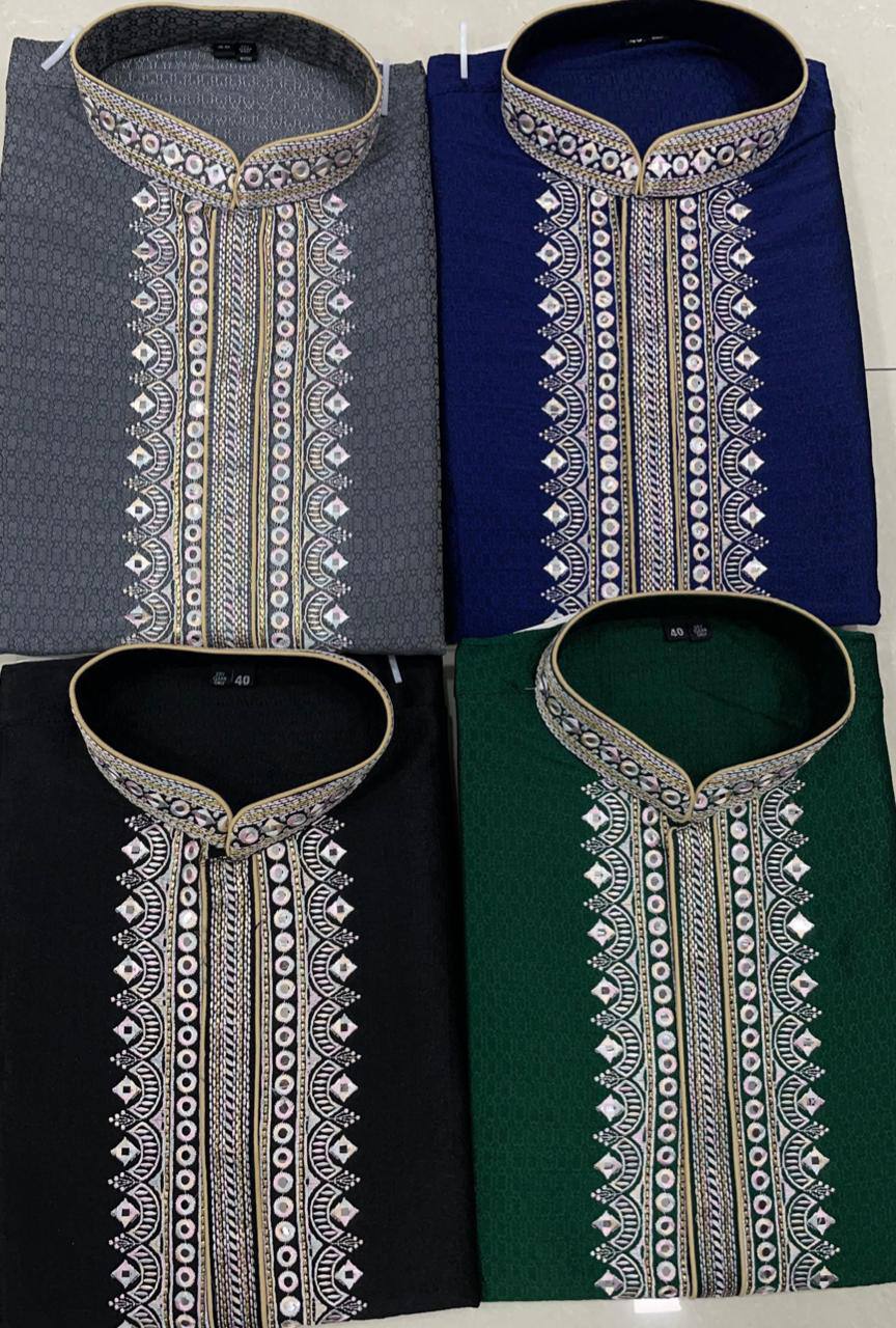 Grey Men's premium cotton jacquard kurta with embroidery at neck with pajama