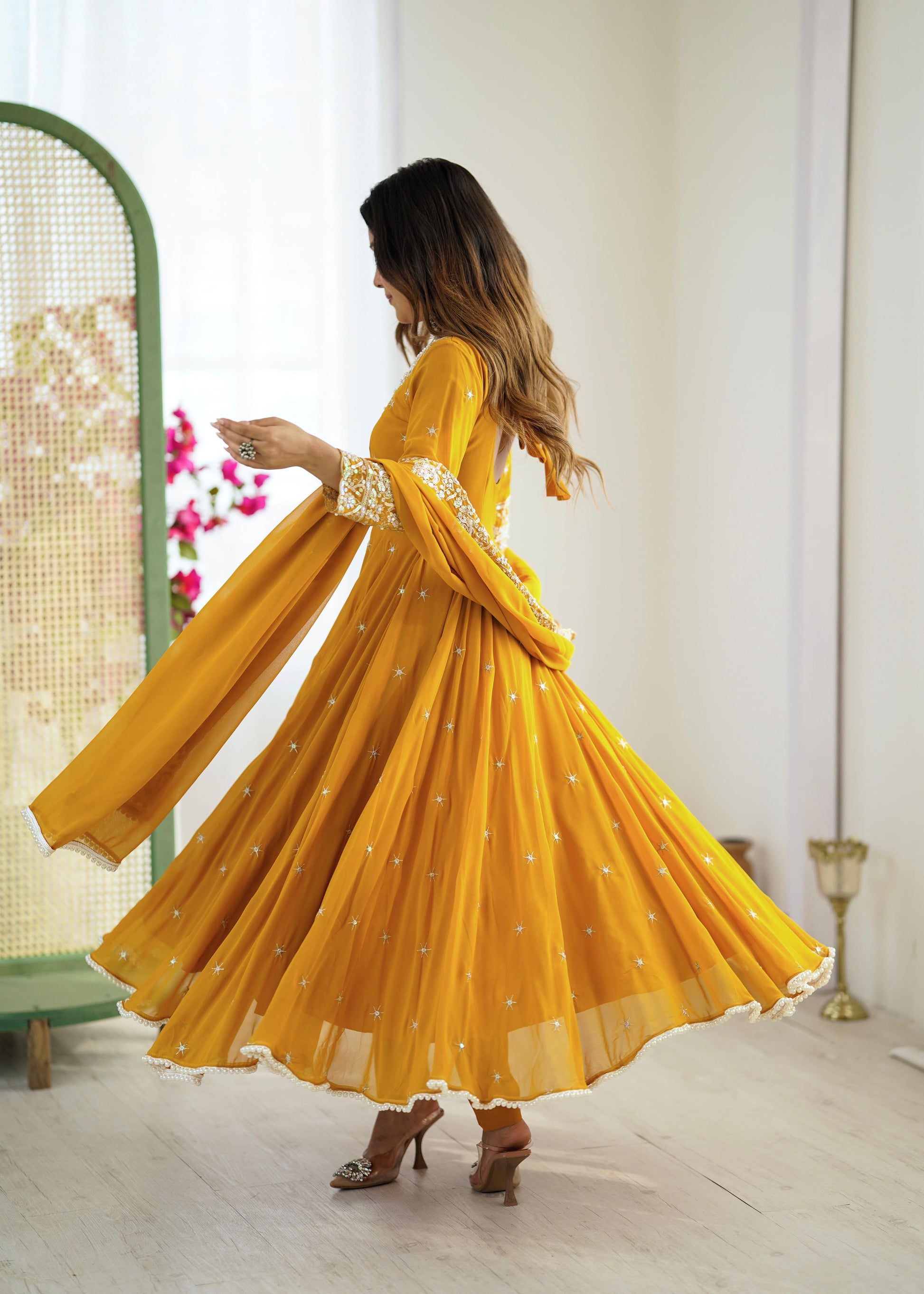 Mustard Premium Faux Georgette Anarkali Gown with Beautiful Work Fully Readymade