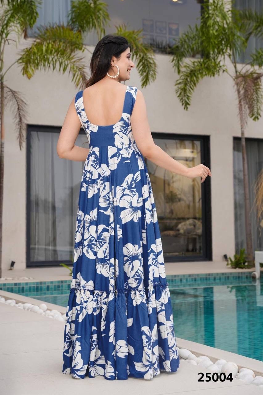 Blue Floral Soft Rayon Fabric Comfy Casual Gown Fully Stitched